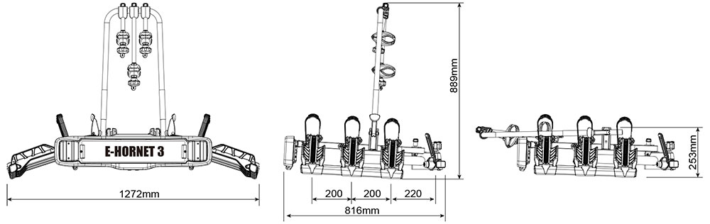 • Maße BxTxH): 127 x 82 x 89 cm gemessen von der Mitte der Anhängerkupplungskugel bis zur Außenkante des Kennzeichenhalters