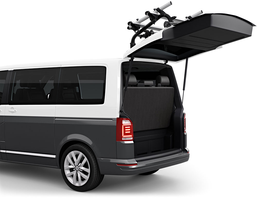 Der Heckklappenfahrradträger Thule WanderWay 2 für den VW T6 ist auf den Transport von 2 Rädern ausgelegt, mit dem WanderWay 3rd/4th Adapters kann die Ladekapazität auf bis zu 4 Räder erhöht werden. Dank der erhöhten Position des Trägers bleibt die Sicht auf die Rücklichter für den nachfolgenden Verkehr erhalten.